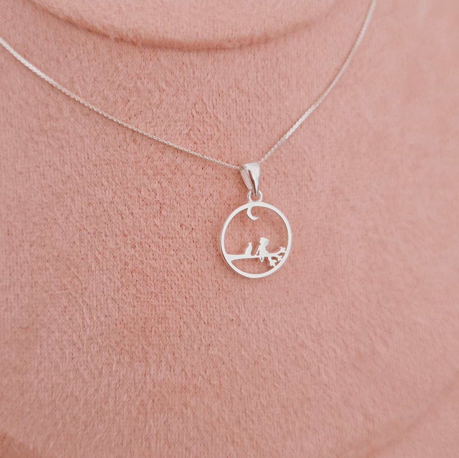 Gargantilla con cadena de 40cm y dije de niña y gatito bajo la luna plata 925